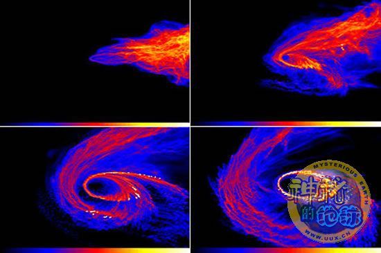 借助计算机模型,爱丁堡大学和圣安德鲁斯大学的天文学家模拟出了下面的环境:一个重量达太阳10万倍的气态云团正在向10光年外的一个超级黑洞靠近,按照其运行的速度,预计将在两万年后到达黑洞附近区域。而在此之前,该云团所拥有的大部分物质都会被黑洞产生的强大引力所攫取。但让科学家们感到意外的是,云团中剩下的物质(不足最初的10%)竟然会演化为一个高密度的气态圆盘。而在经过相当长的时间后,该圆盘便会演化为一个巨大的恒星。