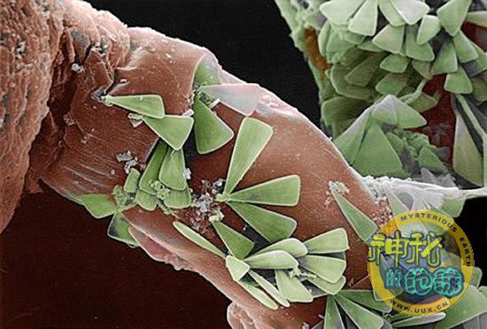 这张图像表现的是显微镜下海洋硅藻,这是一种长有奇特晶体状细胞壁的单细胞海藻生物,如图所示,它们在海洋环境下附着在海洋无脊椎动物身体上。该图像的拍摄者 意大利那不勒斯第二大学的马里奥·德斯特范诺使用扫描电视显微镜拍摄这张微观图片。