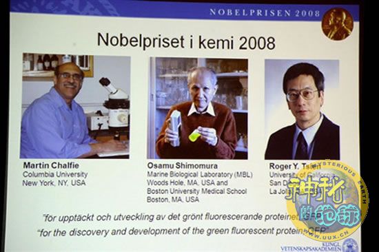 北京时间10月8日下午5点45分,2008年诺贝尔化学奖揭晓,三位美国科学家,美国Woods Hole海洋生物学实验室的Osamu Shimomura(下村修)、哥伦比亚大学的Martin Chalfie和加州大学圣地亚哥分校的Roger Y. Tsien(钱永健,钱学森的堂侄)因发现并发展了绿色荧光蛋白(GFP)而获得该奖项。人们之前对该奖项的预测成为现实。