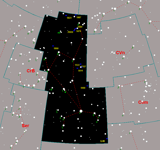 牧夫座的星图,古希腊人把它想象为一个凶猛的猎人,右手拿着长矛,左手高举,恨不得一把抓住面前的大熊。每当暮春初夏的日子,牧夫座就在我们头顶,这时正是这个年轻猎人踌躇满志,最为得意的时候。