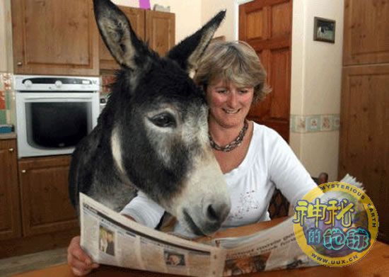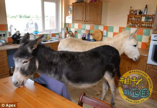 6岁的小驴“霍丽”和它的新伙伴1岁的“查理”就是在这样的 “政策”下融入了费里尔的家庭生活。据费里尔夫人介绍,这两头小驴特别喜爱法国吐丝面包、香蕉、饼干和三明治,它们每天与主人共进晚餐。“霍丽”原是爱尔兰的一头街头小驴,2年半之前被费里尔夫妇收养。它起初是在费里尔先生外出工作时被允许进入屋内陪伴夫人的。