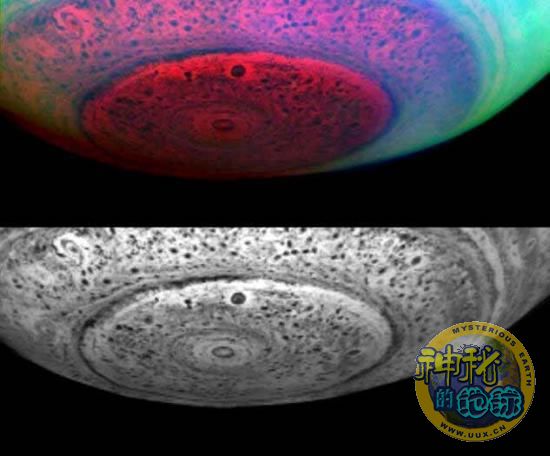 地球上的飓风是从海洋获得热量和水分,但是土星上的气旋与此不同,因为土星气旋的底部并没有水体。土星上的风暴都聚集在两极,而地球上的飓风会在海洋上到处漂移。“卡西尼”绘制了土星整个北极的地图,图片中直径只有120公里的可见物都在这张地图上标了出来。在北极周围盘旋的云团的延时动态影像显示,像漩涡的气旋以每小时325英里(约523公里)的速度旋转,比在地球气旋内测量到的最强的风速快2倍。气旋的周围是像蜂房一样的奇怪的六边形,当它内部的云团突然快速移动时,这种奇怪的六边形好像丝毫没动。令人吃惊的是,好像既不是六边形内部快速移动的云团,也不是气旋瓦解了这种六边形特征。