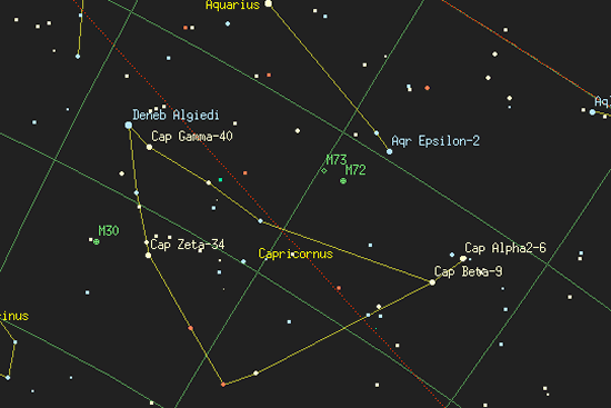 M30,这是一个球状星团,星等是+7.5,用一架小型望远镜观测,它的大小也只有5弧分,要看清它必须使用6英寸(15厘米)的望远镜。它与地球的距离是24000光年,在这个星团中心的北边还有两排不显眼的恒星。