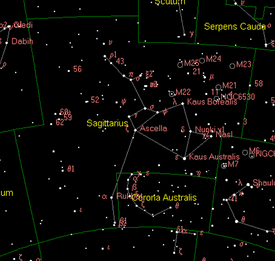 M55:在箕宿二西面约7.5°的M55。这是一个明亮结构松散的球状星团,用8英寸(20厘米)望远镜容易分辨。其星等是+7.0,距离地球20000光年。