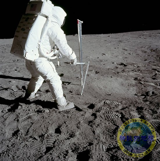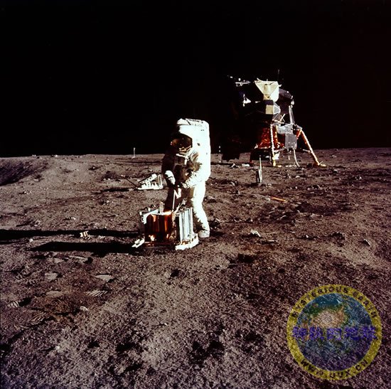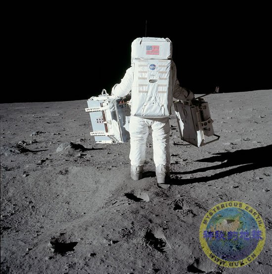 “阿波罗-11”任务期间尼尔•阿姆斯特朗拍摄的,照片所示为Buzz Aldrin带着EASEP科研仪器前往该仪器的部署地点。
