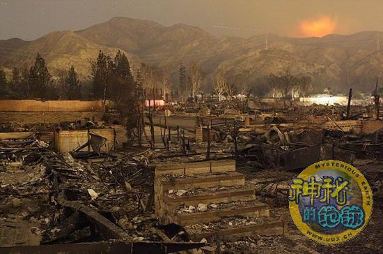 1000多名消防队员在消防直升机的支援下进行着灭火工作,他们面对的温度高达70度。唯一的安慰是只有13人在火灾中受伤。到目前为止,山火已烧毁了至少70套价值数百万美元的豪宅。长期住户切端-简森、加里-简森称,他们首先收到了电话报警,在火势逼近时驾车撤离。他们16日返回时发现他们价值2百万美元的房屋已被夷为平地,在厨房的废墟里还可以看到处于半溶化状态的冰箱。切端-简森称:“现在只剩下了烟尘。”山火在六个小时内就吞没了800英亩的土地,使豪宅区的数个街区全为一片废墟。电视台直升机拍摄到的画面显示,数套位于山边的豪宅仍在燃烧中,消防队员基本上无力制止火灾。
