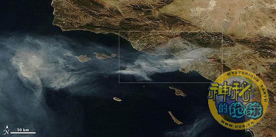 美国航天局“阿卡”卫星新一代遥感传感器所拍到的加州火灾图片,可以清楚地看到洛杉矶周边地区的烟雾。