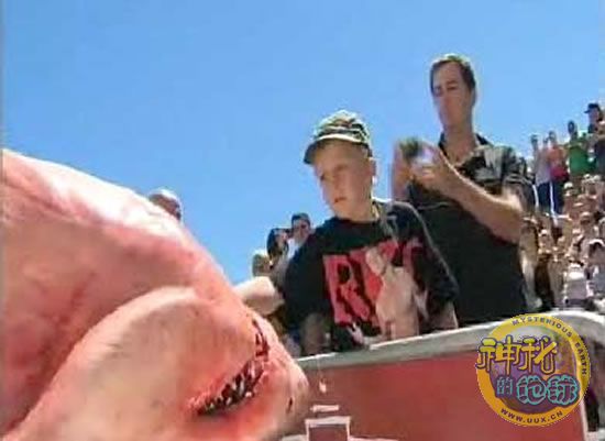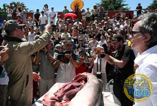 据报道,许多孩子和鲨鱼攻击过的受害者挤在4000多蜂涌的人群中,目睹一条3米长、重300公斤的大白鲨被奥克兰市博物馆的科学家肢解。据说另有3万人通过网络直播观看了此次鲨鱼解剖的全过程。在解剖时,科学家检查了鲨鱼胃里的东西,测量了其内脏器官,并将得到的全部信息汇报给国际鲨鱼研究机构。
