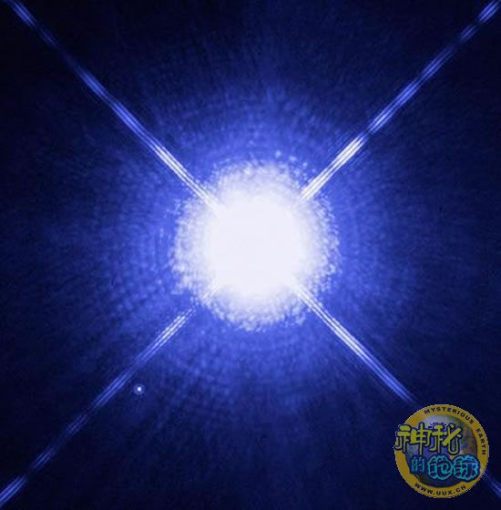 这张照片上的那颗光彩夺目的蓝星其实并不是我们要说的白矮星,真正的主角是照片左下角那个灰白的圆点。这两颗星分别被称作天狼星A(Sirius A)和天狼星B(Sirius B),二者结合,形成一个双星系。体积较小的天狼星是距离地球最近的白矮星,大约相距8.6光年,因此,只要天文学家能把它发出的光与灿烂夺目的伴星发出的光分开,这颗星就能为我们研究白矮星提供千载难逢的机会。虽然天狼星B的体积比地球的小一些,但是它的质量却比地球大很多倍,重力场大约比地球的重力场大350000倍。因此,如果一个体重是150磅的人站在这颗白矮星上,他的体重将变成5000万磅。