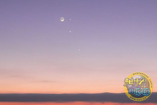 此时月盘黑色部分被地球反射的阳光照亮,看起来就像一轮玉盘托着一颗宝珠。当然,那天早上因为有三颗行星与空中的月亮为伴,这个可遇不可求的宇宙美景图更加令人过目难忘。该奇观是在日出前,在澳大利亚新南威尔士中央海岸塘鹅生态保护区(Tuggerah Lake)东侧的地平线上方出现的。从照片上可以看到,陪伴在娥眉月身边的是明亮的水星、木星和火星。