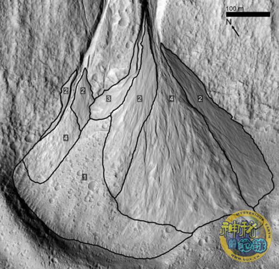 科学家在一个年代不超过125万年的陨石坑内发现了扇状水渠。他们认为,这些水渠或许是冰融化成水后在火星表面留下的痕迹。同时,科学家还发现了含水沉积物从高处流下来,沉淀于低地冲积扇的证据。