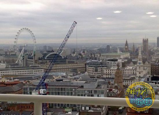 今年40岁的德里克-伯登(Derek Burden)在伦敦西区的科芬园的16层高楼处发现令人惊异的UFO景象,拍摄时间是早上8点30分。但是伯登只用手机拍摄了一张照片,这件事发生在几天前,当时他的妻子莎拉注意到厚云层的太空中隐约出现了几个特殊形状的飞行物,伯登说:“当时我正在等即将送来的一些材料,我便忙中偷闲去阳台喝杯茶,依据妻子所描述的不明飞行物,我在16层楼拍摄起来十分方便。”他还指出,这4个UFO释放的光线并不是任何典型的光线折射,并证实在拍摄时身旁并没有任何特定光源进行伪造拍摄。