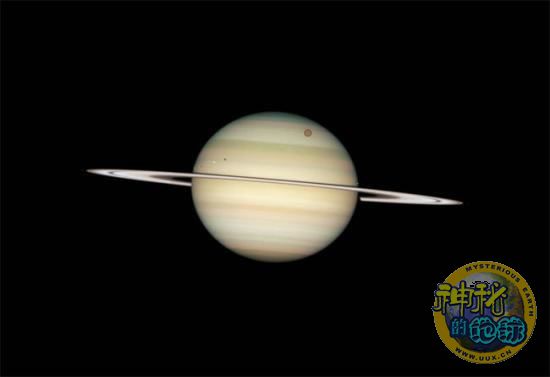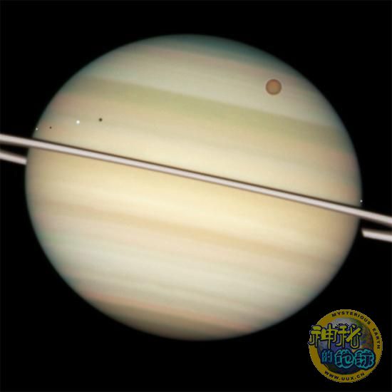 在这张图片中,巨型橙色卫星--土卫六“泰坦”在土星北极地区投下一个巨大的阴影。位于“泰坦”下方靠近环面并处在最左侧的是土卫一“弥玛斯”,在土星赤道云顶投下一个相对较小的阴影。距离左侧更远并位于土星盘之外的是明亮的土卫四“狄俄涅”和亮度较为暗淡的土卫二“恩克拉多斯”。