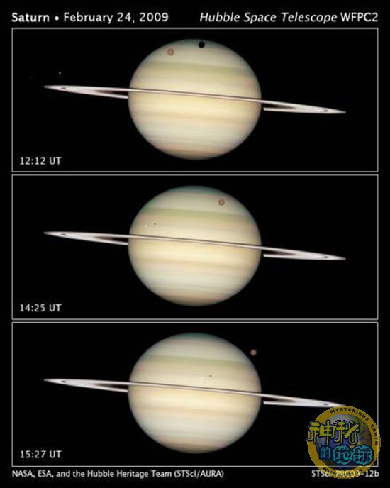 3张连续图片展现了土星的几颗卫星在这颗气态巨行星前方穿过的景象。这是一种罕见的“卫星凌土”现象,因为土星环面与地球侧向相对每15年才出现一次。