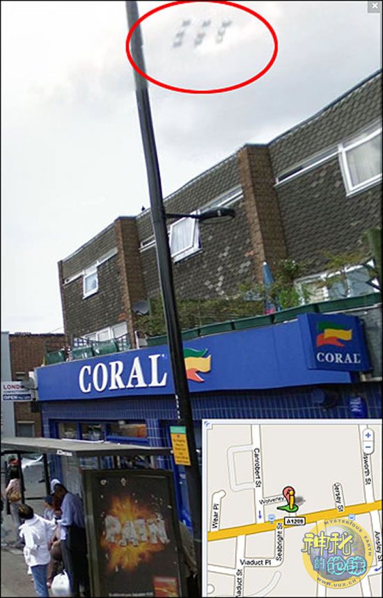 据英国媒体30日报道,世界最大搜索引擎谷歌的“街景”工具,竟在大白天拍到成群结队的“UFO”。据悉这些半球形的神秘物体盘旋在英国伦敦东部的街道上空,久久不曾离去。