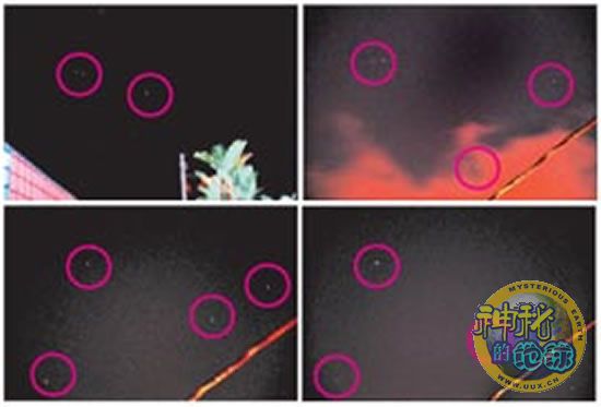 一名高等学府公关经理通过数码相机,拍到上空出现多个不明发光物体(圆圈处)。