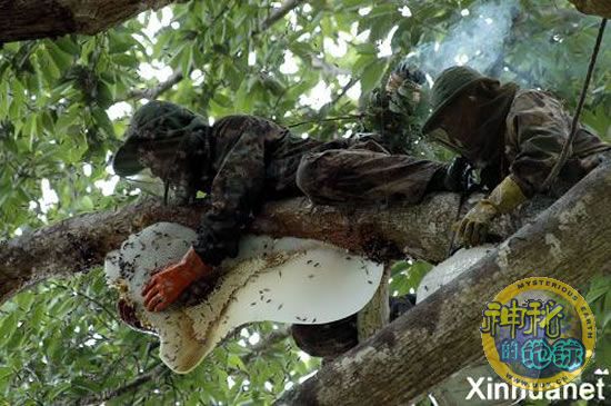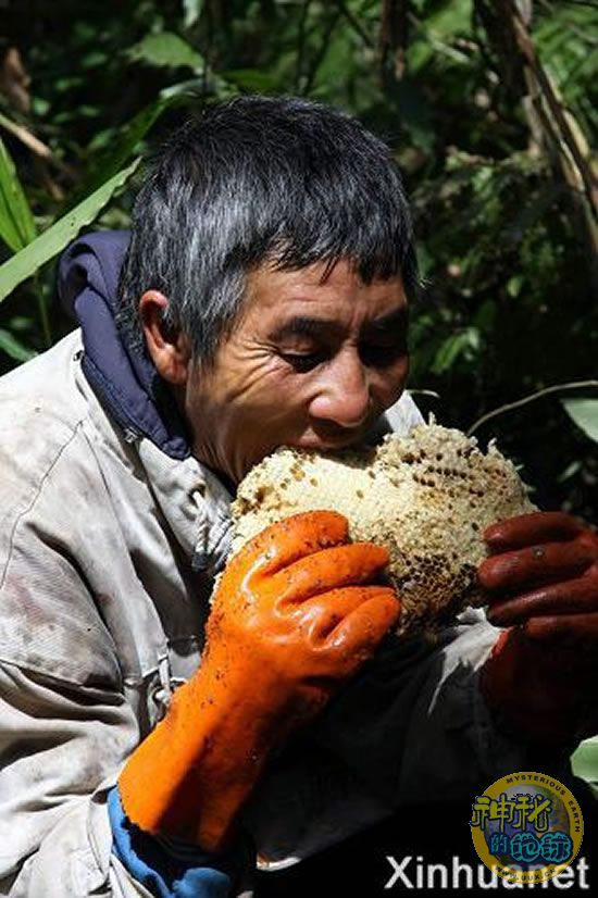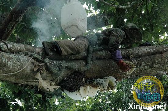 每年的4月、5月间,云南省勐腊县尚勇乡曼庄村村民殷事良便带着两个儿子在雨林中采集野生蜂蜜,他们以独特的技巧爬上数十米高的大树,除了一副手套和头部网罩外不需要其它防护措施,先用烟熏的方式驱走蜜蜂,然后采集蜂蜜,一天下来能收获一百多公斤蜂蜜。殷事良从事采蜜已有30多年,从2000年开始,两个儿子殷志和、殷志江跟随父亲学习采蜜,如今已成为他的得力助手。每年这个季节,父子三人采集的野生蜂蜜都在2000公斤以上,远销到广东等地。