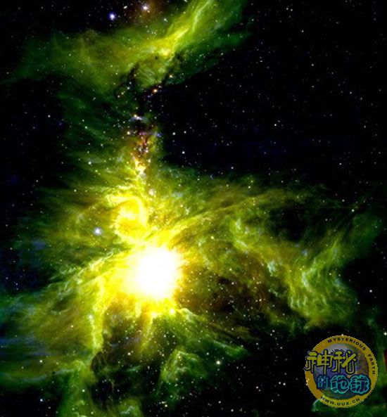 猎户座星云的部分分子云被附近的恒星照亮而发绿光,喷射气体为紫红色,喷射气体的恒星则呈现金黄般的橙色。