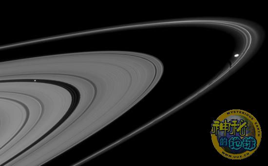 这幅图是土卫十一在土星A和F光环前旋转的画面。在云雾笼罩下的土卫六面前,土卫十一相形见绌。