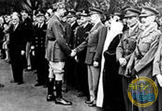 1942年7月,戴高乐(面向人群者)在伦敦与艾森豪威尔握手