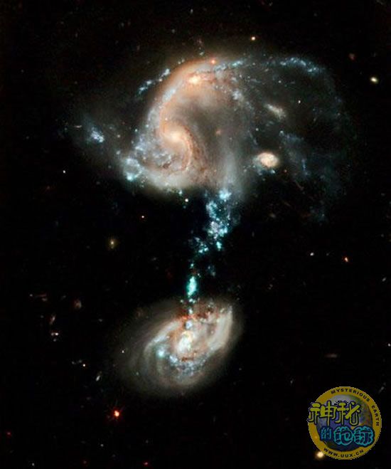 过去19年间,哈勃太空望远镜拍摄到很多大规模撞击和近距离相遇的天体图。最近该望远镜拍摄到的一张新图片上展示了三个星系,这个星系群被称作Arp 194。从图上看,感觉好像有物质从一个星系中泄露出来。图片中出现的明亮的蓝色彩带,其实是新生蓝色恒星向外延伸的完整的螺旋臂。当两个星系利用引力相互作用时,就会出现这种现象。