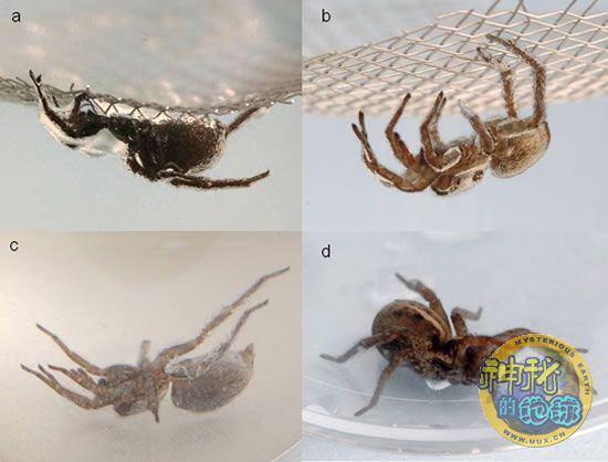 实验:a图为水淹开始,b图表明此蜘蛛已经失去反抗能力,c图表明此蜘蛛已经昏迷,d图表明此蜘蛛结束水淹实验后40小时起死回生。