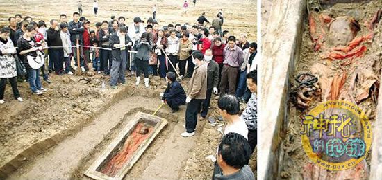 荆州古城西门外发掘出完好的古尸 来源: 蜘蛛网 时间:2009年4月28日 14:24 昨日,荆州古城西门外发掘出一具保存十分完好的古尸,长约1.6米,身裹红绸,头发依稀可见,手上经脉清晰,指甲修剪整齐,手腕上戴着大串黑色玛瑙。荆州博物馆馆长王明钦说,保存如此完好的古尸十分罕见,其性别、年代、身份等仍在考证中。 来源:楚天都市报 记者刘汉泽 通讯员江汉 上一篇 下一篇 TAG: 古尸