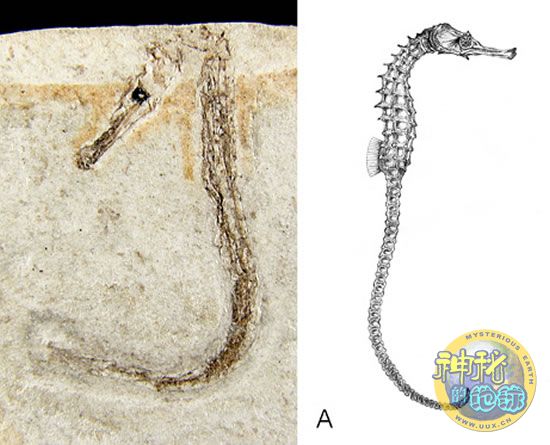 左图为一条5厘米长的成年雌性海马化石,右图为其复原图