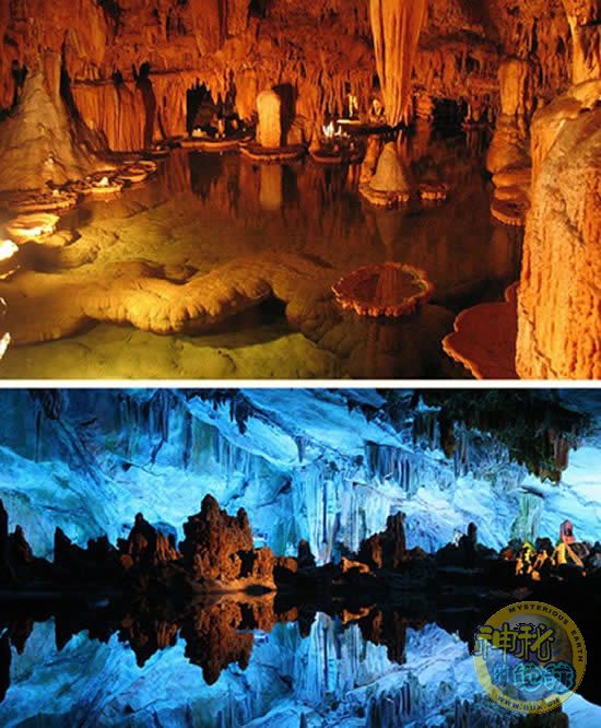 在上图中我们可以看到两个风格截然相反的洞穴:第一张图是美国密苏里州的欧若恩多加(Onondoga)洞穴,它具有奇特的钟乳石,摄影师形象地将它们描述为“利莱垫”和“结肠”,很像世外仙境。下图是位于中国南部的著名洞穴——桂林的芦笛洞穴,洞内有大量奇幻多姿、玲珑剔透的石笋、石乳,总长达240米。