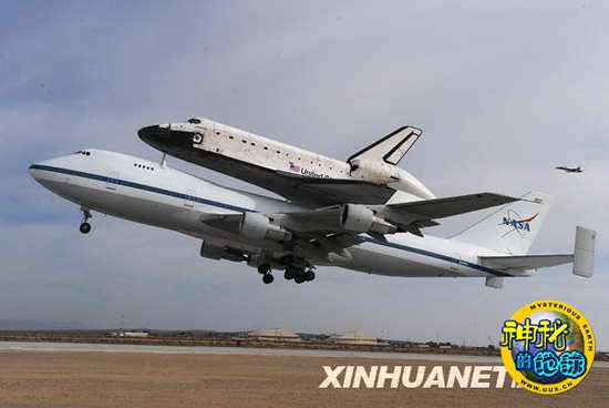 “阿特兰蒂斯”号航天飞机(上)搭乘经过改装的波音747飞机,启程返回美国航天飞机的大本营