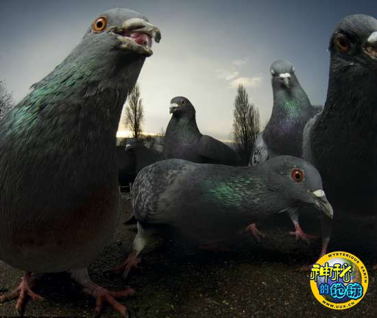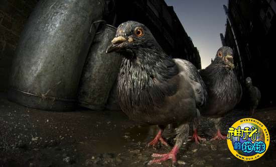 鸽子们围坐在隐藏的摄像机前
