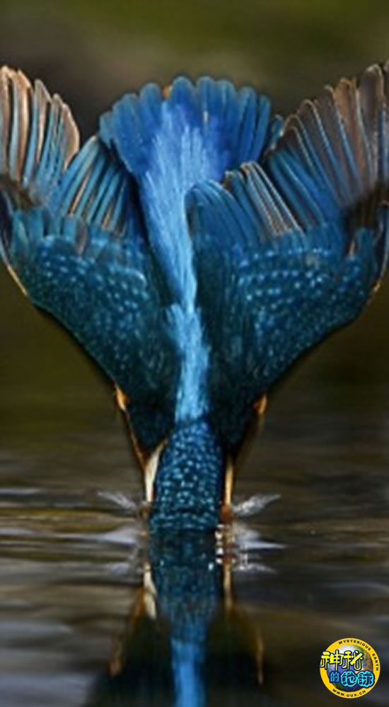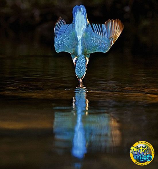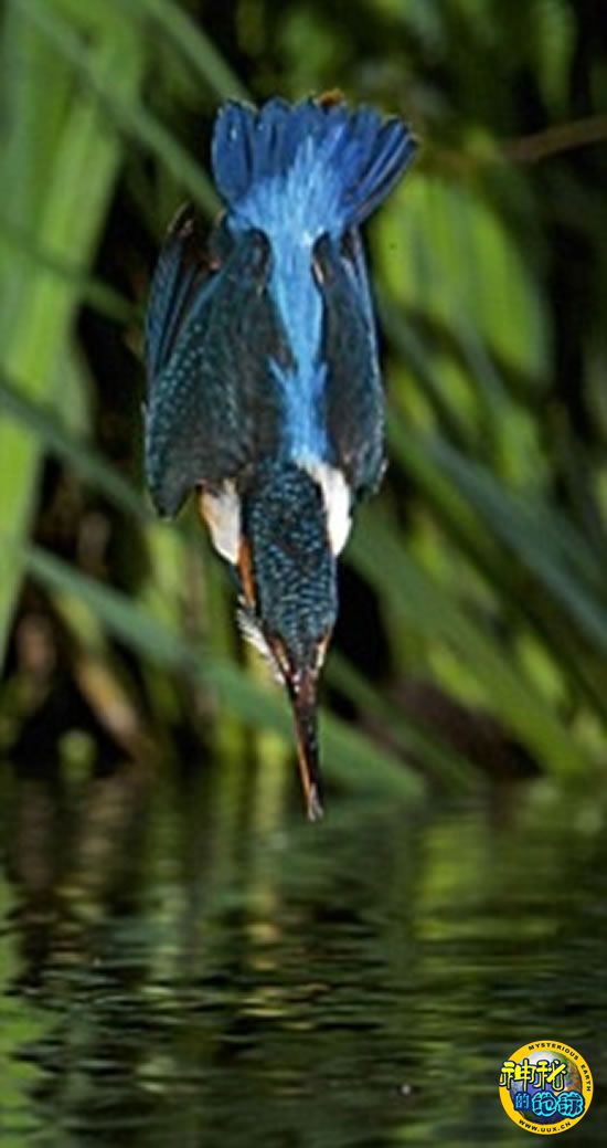 翠鸟到达水面 这张照片显示的是,翠鸟到达水面、钻入水下捕鱼。翠鸟的捕鱼本领几乎是百发百中,毫无虚发,因为翠鸟扎入水中后,还能保持极佳的视力,因为,它的眼睛进入水中后,能迅速调整水中因为光线造成的视角反差。