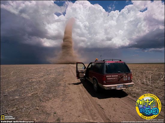 陆龙卷风伸向天空长达4,000英尺,陆龙卷风之所以得名是因为它们与海上龙卷风有类同之处,它们是经由雷暴或高耸的堆积云形成的龙卷风。这张令人惊异的照片是由美国最著名的“风暴猎人” 摄影师吉姆里德于2008年5月8日拍下的。15年来他一直记录着美国自然现象的发生。这张照片刊登在美国《国家地理杂志》第6期上。而这次穿过堪萨斯州的龙卷风是美国历史上187次龙卷风中的一次。