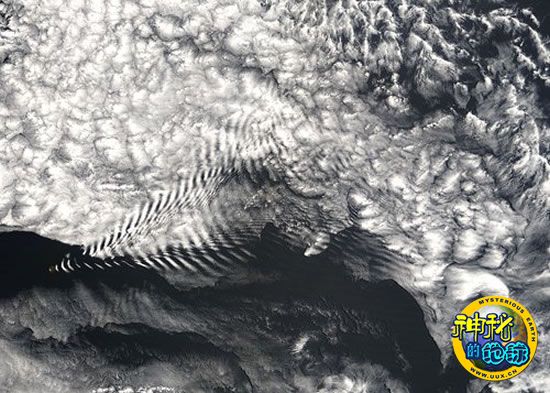 当这一云层结构向下延伸至岛屿时,就如同船只穿行水面留下的波纹,一直延伸至数百公里,最终向北混入积状云的边缘。