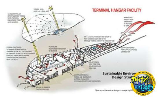 美国航天港将于美国时间6月19日在新墨西哥州开工建设,计划于今年底或明年完工。美国航天港将建在新墨西哥州南部沙漠地带,飞机库和航站楼占地面积总共将达9万多平米,这两大主建筑总耗资将达3100万美元。美国航天港的设计方案由美国URS公司和英国一家公司组成的联合设计小组完成,他们是从11家国际大公司胜出的。美国航天港的设计极富未来派色彩,并不很高的航天港形状像一幅绝美的日出景象。 美国航天港是一个“环境友好型”建筑综合体,对周边环境的影响将控制到最低程度。航天港很多部分都将建在地下,耸立在地面上的造型独特的主建筑与环境互相协调,从外观上看,整个航天港将与沙漠几乎浑然一体。来此参观的游客都可以获得“终极体验”。