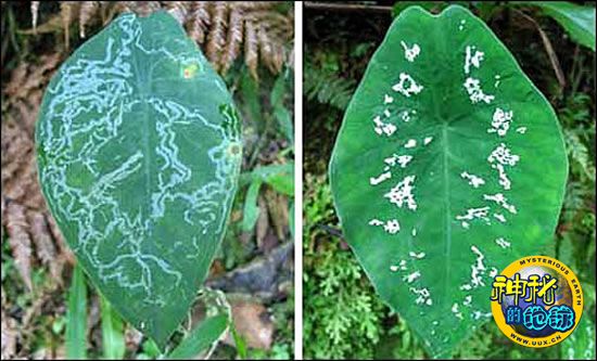 德国拜罗伊特大学的一组科学家在对厄瓜多尔南部丛林中的林下叶层植物进行研究时注意到,一种名为贝母Caladium steudneriifolium的植物身上,绿叶要比斑叶遭受虫子啃咬的多得多,矿蛾会将卵直接产在树叶上,新出生的毛虫会大肆吞噬树叶,并在身后留下一条长长的破坏过的白色痕迹。