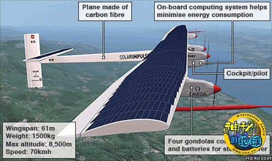 太阳能飞机样机HB-SIA的翼展达到61米,但重量只有1500公斤,将接受一系列飞行测试,证明其可以在夜晚飞行。皮卡德是世界首位驾驶热气球不间断飞行环绕地球一周的冒险家。他表示,希望HB-SIA能够展示可再生能源的潜力。皮卡德有望在2012年驾驶太阳能飞机飞跃大西洋。
