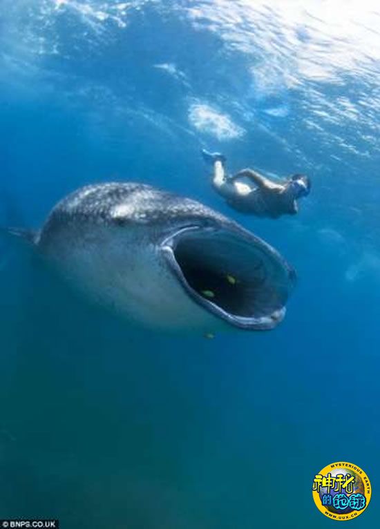 张开大口的鲸鲨在潜水员身后