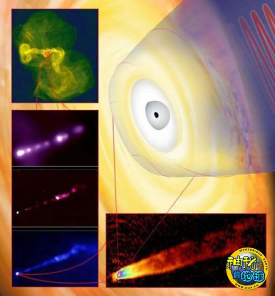 天文学家观测研究发现,在M87星系核心有一个巨大的黑洞,比太阳质量大60多亿倍。黑洞其实也是星球,只不过它的密度极大,靠近它的物体都被它的引力所约束,甚至连光都跑不出来。在大质量黑洞强大吸引力的作用下,黑洞周围被撕碎的恒星、气体、尘埃等物质,包括电子与质子,盘旋地掉向黑洞。在这个过程当中,物质相互摩擦而产生高热,其中一部分高热物质掉进黑洞,而强大的磁场力把另外一部分物质沿黑洞自转轴的方向抛射出去,形成了一道细长的喷流。